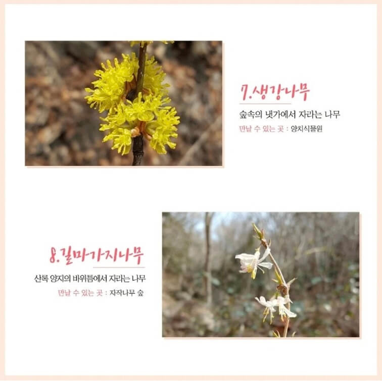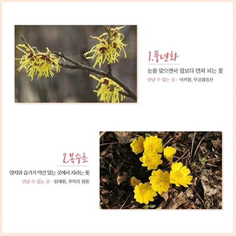 봄의 화담숲은 벚꽃외에도 풍년화, 복수초, 영춘화, 비올라, 매화, 히어리, 생강나무, 길마가지나무도 볼 수 있고 여름 끝자락에 피는 수선화까지 구경할 수 있는 곳이기도 해요.