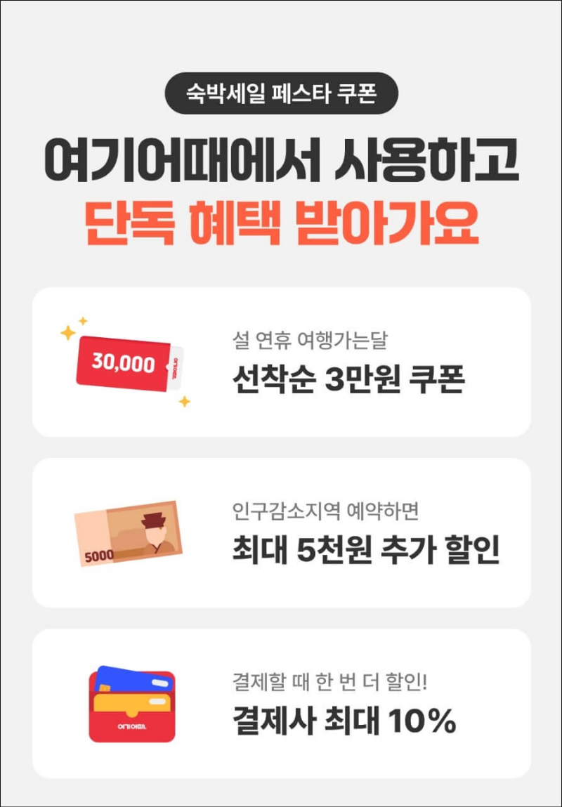2024 대한민국 숙박 세일 페스타를 3월까지 진행하면서 현재는 설연휴를 맞아 야놀자, 여기 어때, 지마켓 3개 온라인 여행사를 통해 할인 쿠폰을 선착순으로 배포하고 있는 거 알고 계시나요? 기본 3만 원 쿠폰에 사이트별 추가 할인 쿠폰을 선착순으로 지급하니 여행계획 있으신 분들은 지금 바로 2024 숙박세일 페스타 3만 원 쿠폰 + 추가할인 쿠폰 받으러 가세요.