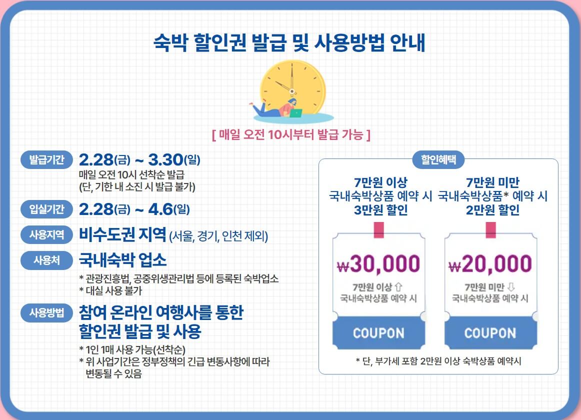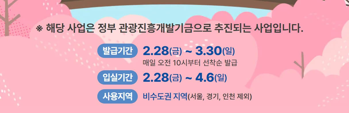 발급받은 숙박 할인 쿠폰은 2월 28일(금)부터 4월 6(일)까지 사용이 가능하며 서울과 경기, 인천을 제외한 비수도권 전 지역에서 사용이 가능해요. 단, 관광진흥법과 공중위생관리법 등에 등록된 숙박업소에서만 사용이 가능하며 대실 사용은 불가능하니 주의하세요.