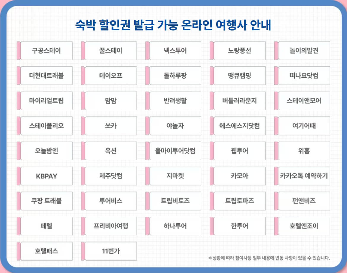 구공스테이, 꿀스테이, 넥스투어, 노랑풍선, 놀이의 발견, 더현대 트래블, 데이오프, 돌하루팡, 땡큐캠핑, 떠나요닷컴, 마이리얼트립, 맘맘, 반려생활, 버틀러라운지, 스테이앤모어, 스테이폴리오, 쏘카, 야놀자, 에스에스지닷컴, 여기어때, 오늘밤엔, 옥션, 올마이투어닷컴, 웹투어, 위험, KBPAY, 제주닷컴, 지마켓, 카모아, 카카오톡 예약하기, 쿠팡 트래블, 투어비스, 트립비토즈, 트립토파즈, 펀앤비즈, 페텔, 프리비아여행, 하나투어, 한투어, 호텔엔조이, 호텔패스, 11번가 등 총 42개 온라인 여행사 업체가 참여하니 평소에 이용하던 여행사 업체를 통해 숙박 세일 페스타 할인 쿠폰을 다운로드하세요.