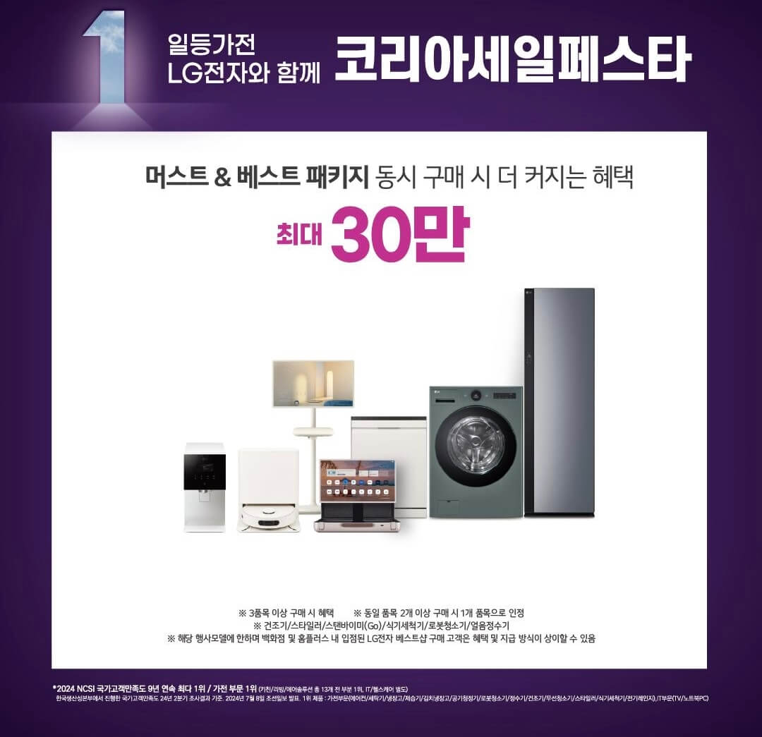 LG전자 제품들은 LG전자 공식 홈페이지뿐만 아니라 지마켓, 옥션에서 진행중인 빅스마일데이에서도 만나볼 수 있고, 9일부터 시작되는 코리아 세일페스타에서도 만나볼 수 있으니까 판매처별 혜택이나 가격을 비교해 보는 것도 좋을 것 같아요.