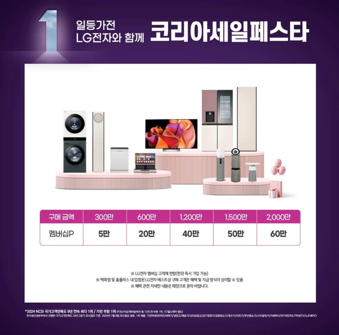 LG전자 제품들은 LG전자 공식 홈페이지뿐만 아니라 지마켓, 옥션에서 진행중인 빅스마일데이에서도 만나볼 수 있고, 9일부터 시작되는 코리아 세일페스타에서도 만나볼 수 있으니까 판매처별 혜택이나 가격을 비교해 보는 것도 좋을 것 같아요.