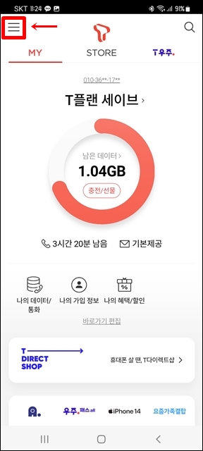소액결제를 차단하거나 한도를 조정하기 위해서는 고객센터를 통해 신청할수있습니다. 하지만 상담원과 통화하는 게 부담스럽다 하시는 분들은 티월드 어플을 이용하면 되는데요~ 먼저 핸드폰에 설치되어있는 티월드 어플을 실행하고 좌측 상단에 있는 메뉴 클릭 후 나의 요금 순으로 들어가 줍니다.