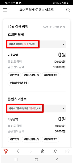 나의 요금 목록으로 들어가서 아래로 내리다가 휴대폰결제 / 콘텐츠 이용료를 클릭하고 다음 단계로 넘어가 주세요. 다음 단계로 넘어가면 휴대폰 결제와 콘텐츠 이용료 목록이 나누어져 있는데 각각 휴대폰결제를 이용 중입니다, 콘텐츠 이용료 결제를 이용 중입니다를 클릭하고 넘어가 줍니다.